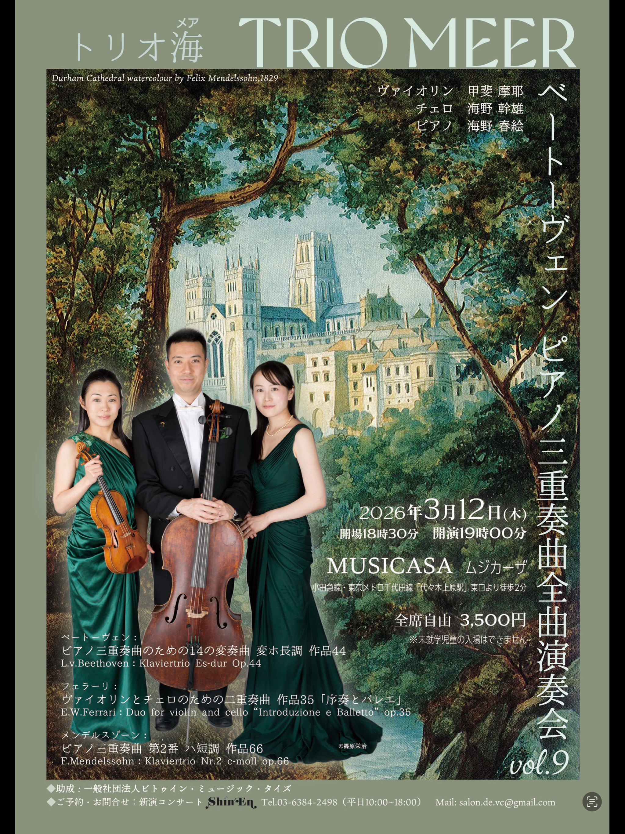 | 曲目 | ベートーヴェン:ピアノ三重奏のための14の変奏曲 変ホ長調 作品44 フェラーリ:ヴァイオリンとチェロのための二重奏曲作品35「序奏とバレエ」 メンデルスゾーン:ピアノ三重奏曲第2番ハ短調作品66 |