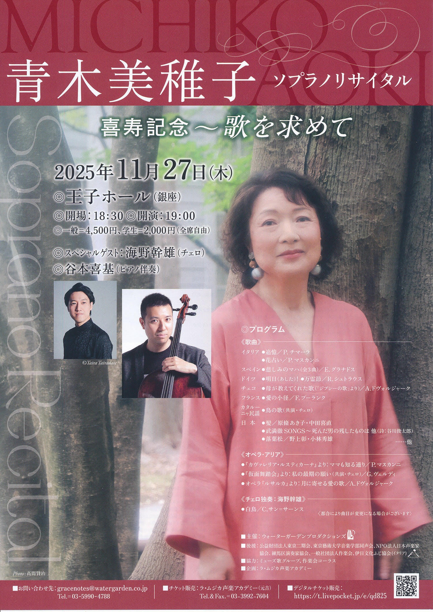 | 出演 | 青木美稚子(ソプラノ) 海野幹雄(スペシャルゲスト・チェロ) 谷本喜基(ピアノ) |
